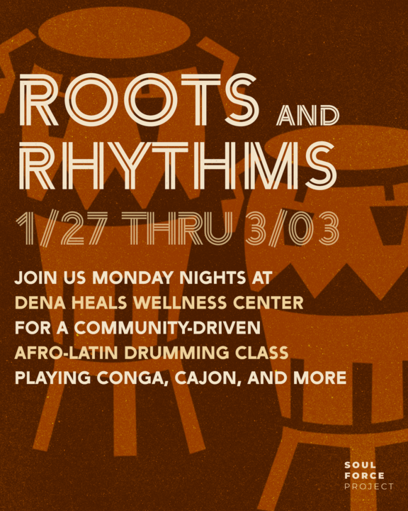 Learn traditional folkloric rhythms of the African diaspora. Play conga, cajon, and other percussion in a community setting welcoming basic and intermediate musicians playing interlocking parts.
